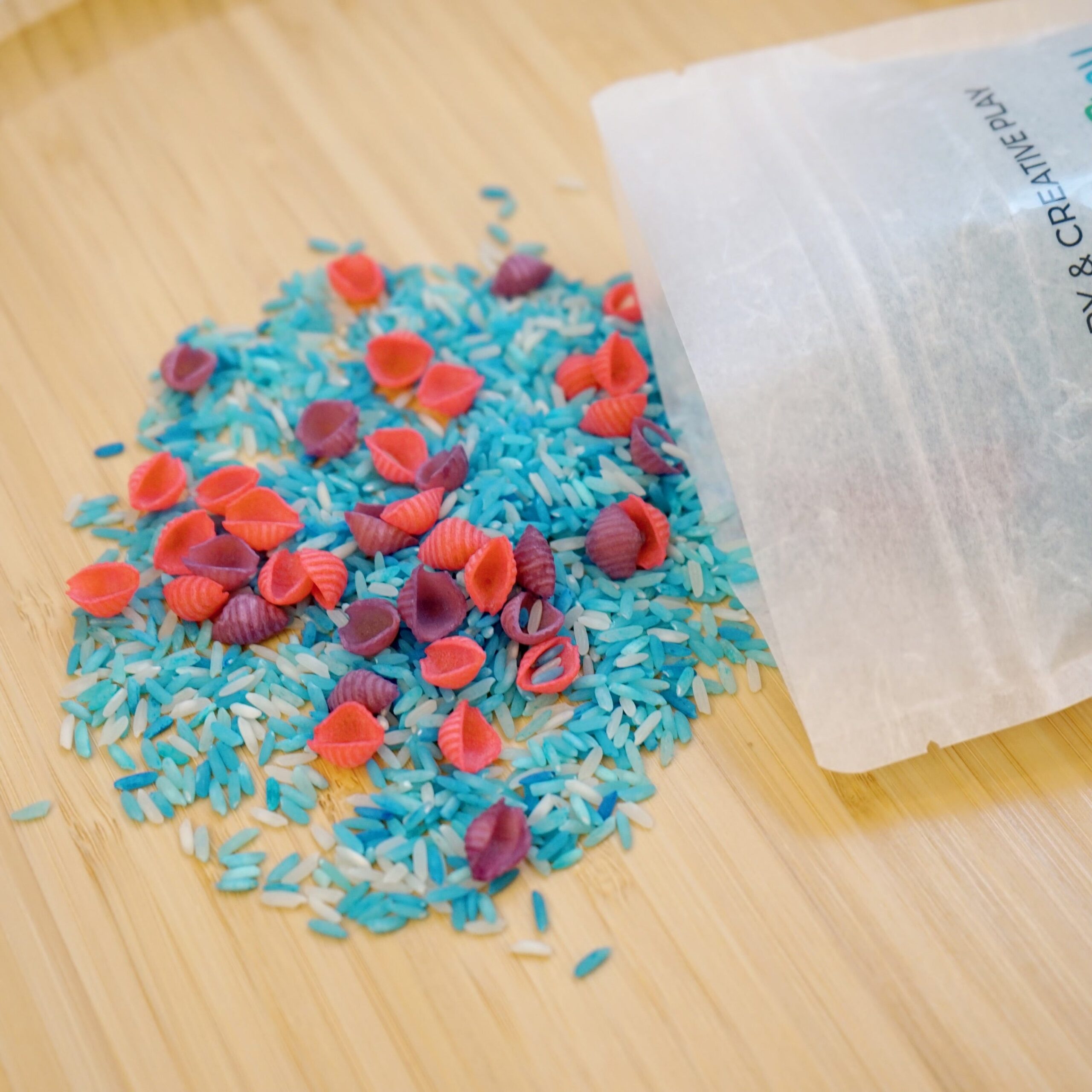 Our Mermaid Sensory Filler is packed in an eco-friendly rice paper zipper bag and contains 600g/1.3lb(approximately 3cups) of colored rice + pasta.