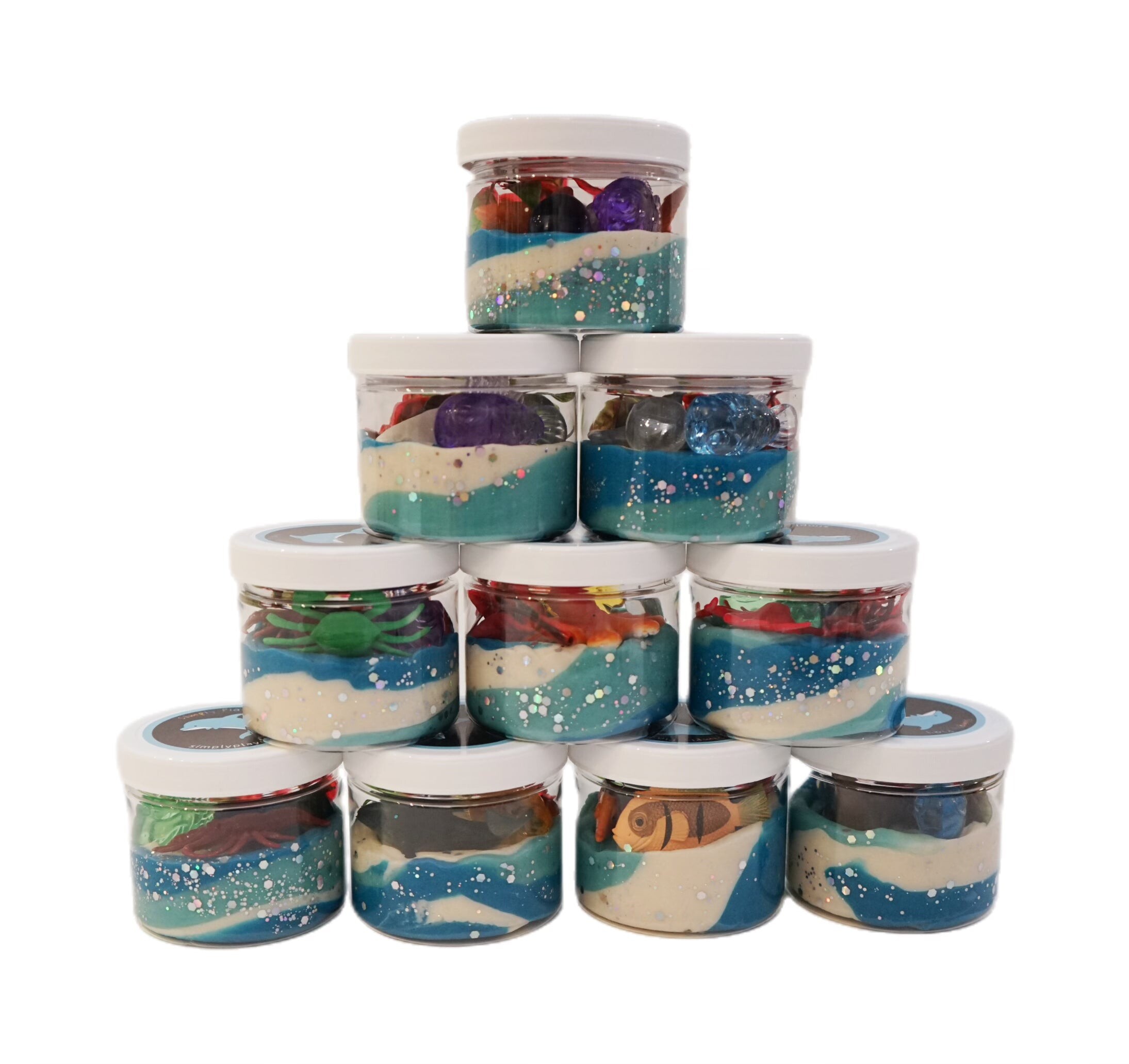 Introducing our party-perfect “Under the Sea” sensory dough jars! These delightful jars are themed with an enchanting ocean swirl dough, accompanied by adorable sandals, sea creatures, and shimmering gems.